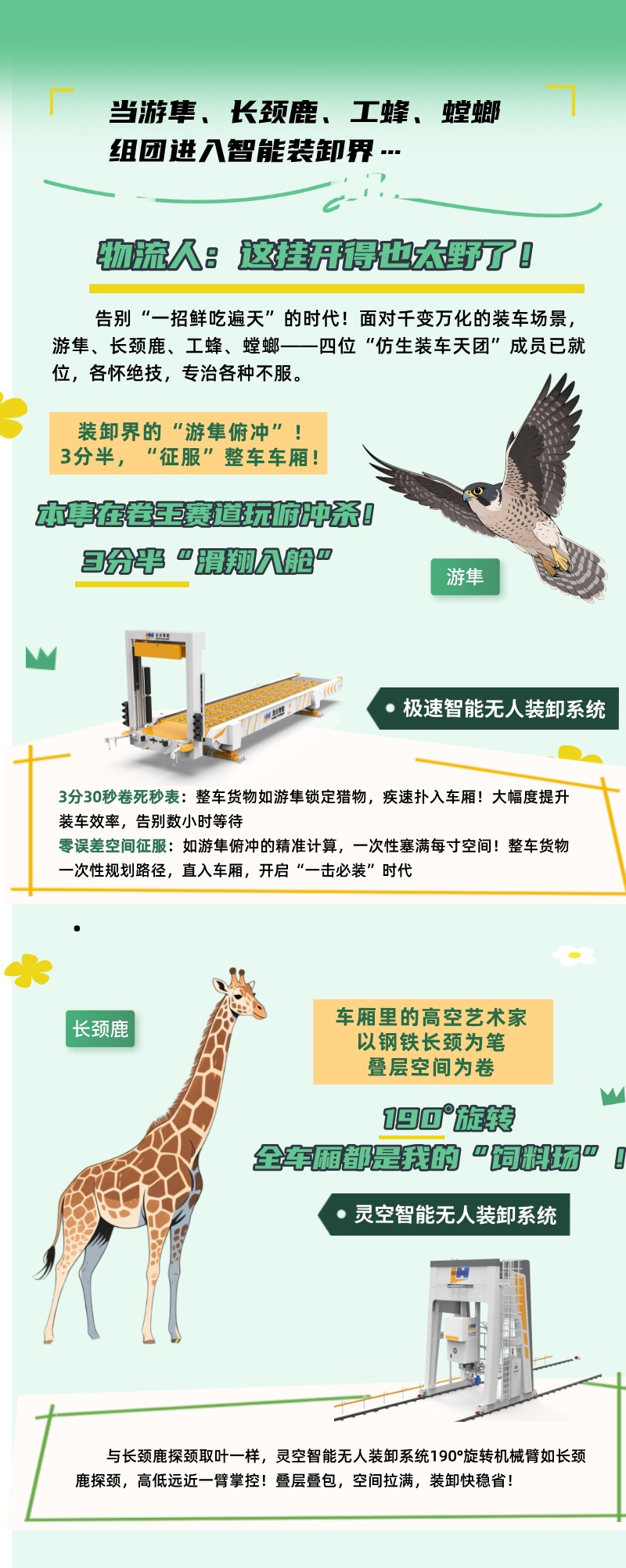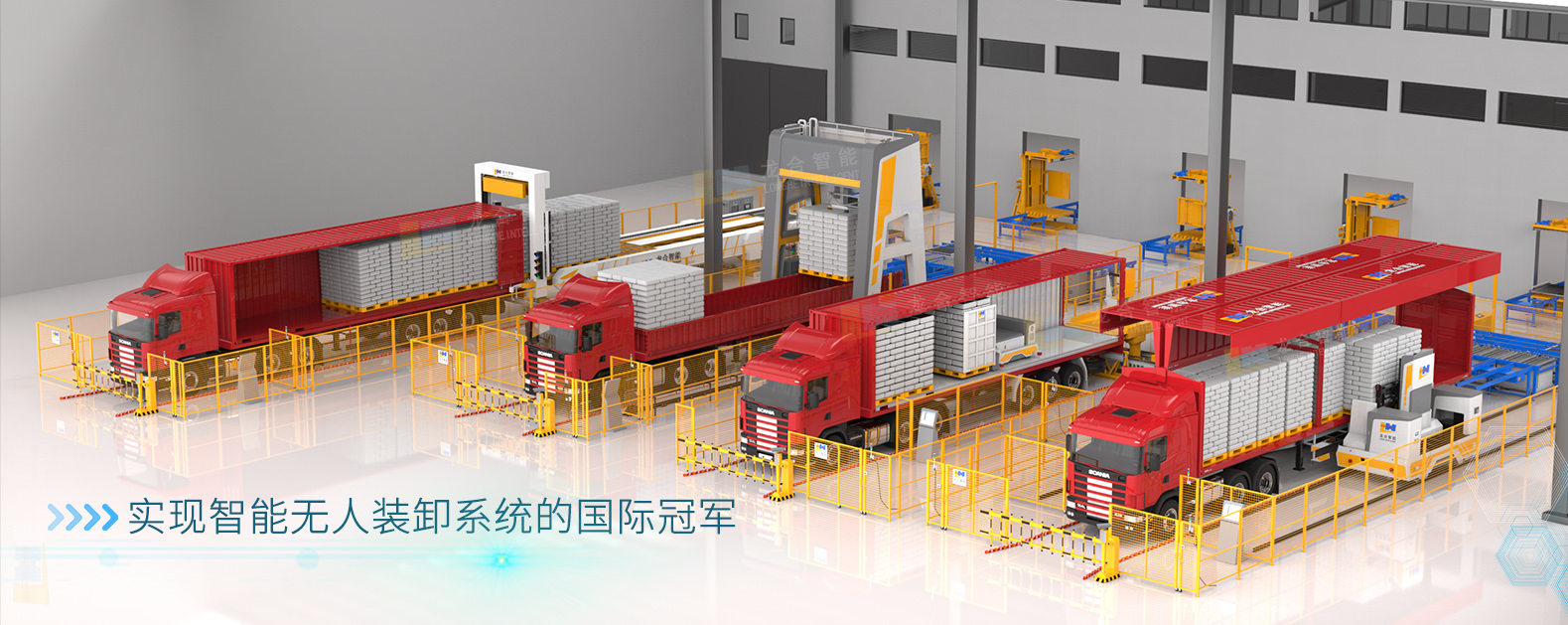 幻影/靈空/極速/勁馳四大產品線:全面覆蓋國內公路運輸所有車型,包括后裝式集裝箱車、飛翼式集裝箱車、卷簾車、邊欄板可拆放及不可拆放平板車等終端物料發貨裝車,裝車過程實現自動化、智能化操作,20分鐘內完成30噸貨物裝車,產品填補國內終端物料智能無人裝車空白,可完全替代國外進口產品,獲評省內首臺(套)重大技術裝備4項、省級重點新產品9項。